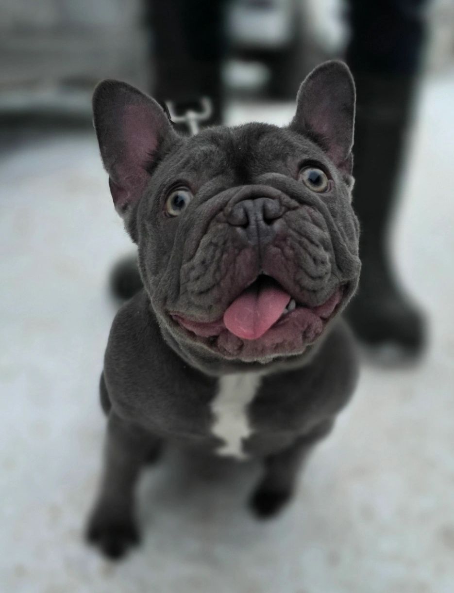Mia is a daughter of Jewels, a beautiful KB blue female carrying testable chocolate, cocoa, and fluffy. She is 6 panel clear, short-backed, and has that classic Frenchie personality we love.